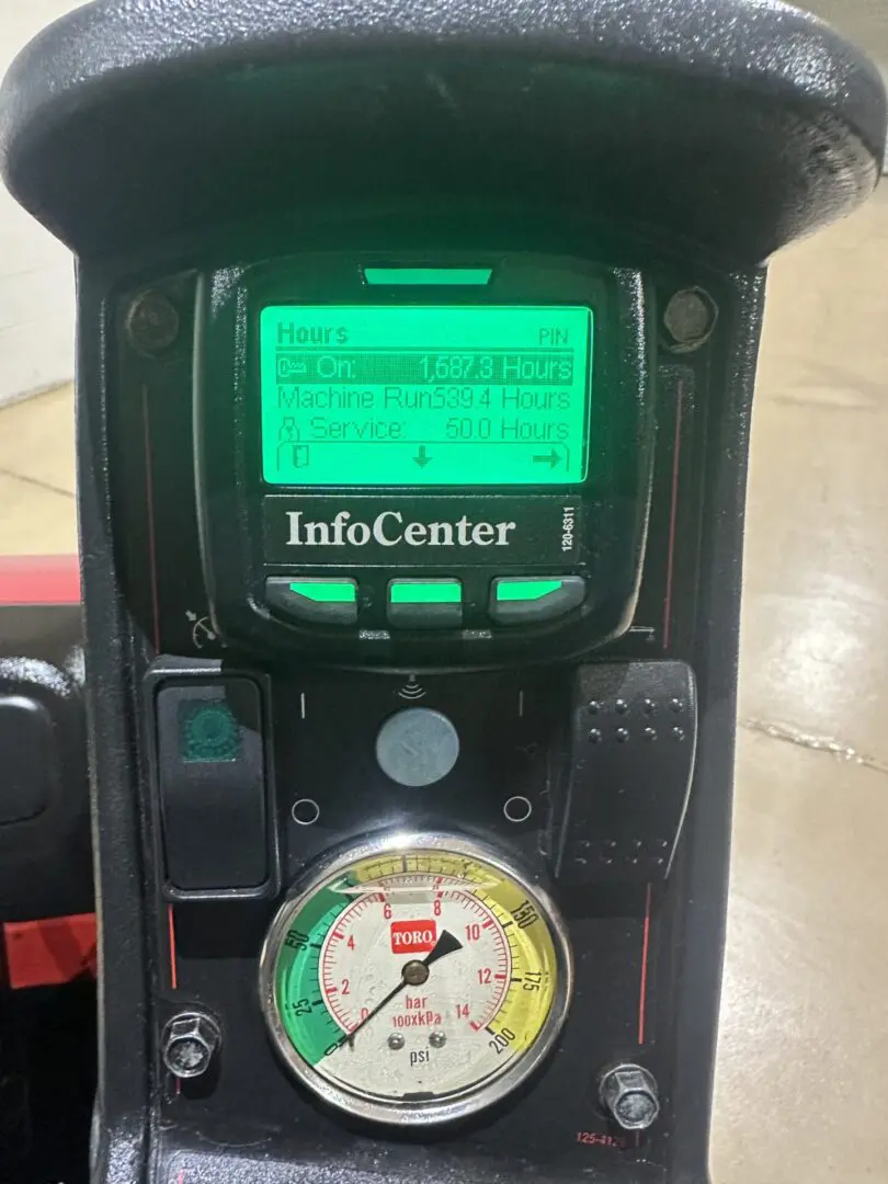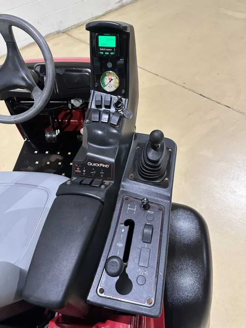 - Quick Find™ Console – The Quick Find™ Console helps the operator intuitively find boom and actuator switches with the palm of their hand and places command of all key vehicle and sprayer systems at the operator’s fingertips for ease-of-use and improved control. The Info Center display and the analog pressure gauge, which are conveniently located just above the boom section and actuator switches, keeps all key sprayer operation data in the operator’s line of sight.